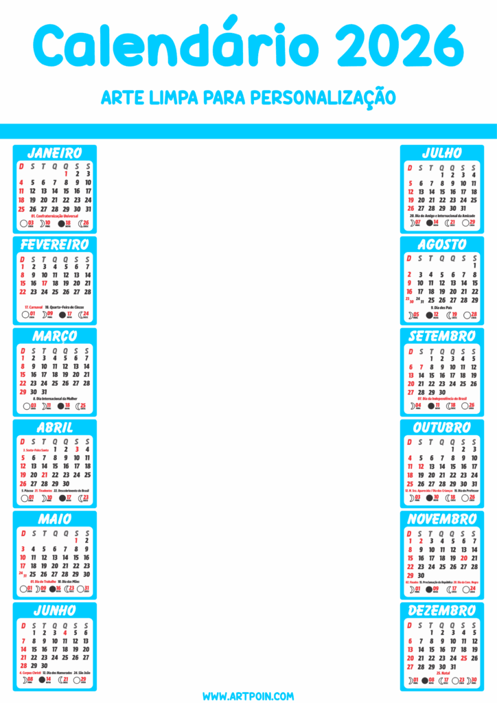 Calendário 2026 azul artes limpas para personalização com fundo transparente pronto para editar e imprimir png
