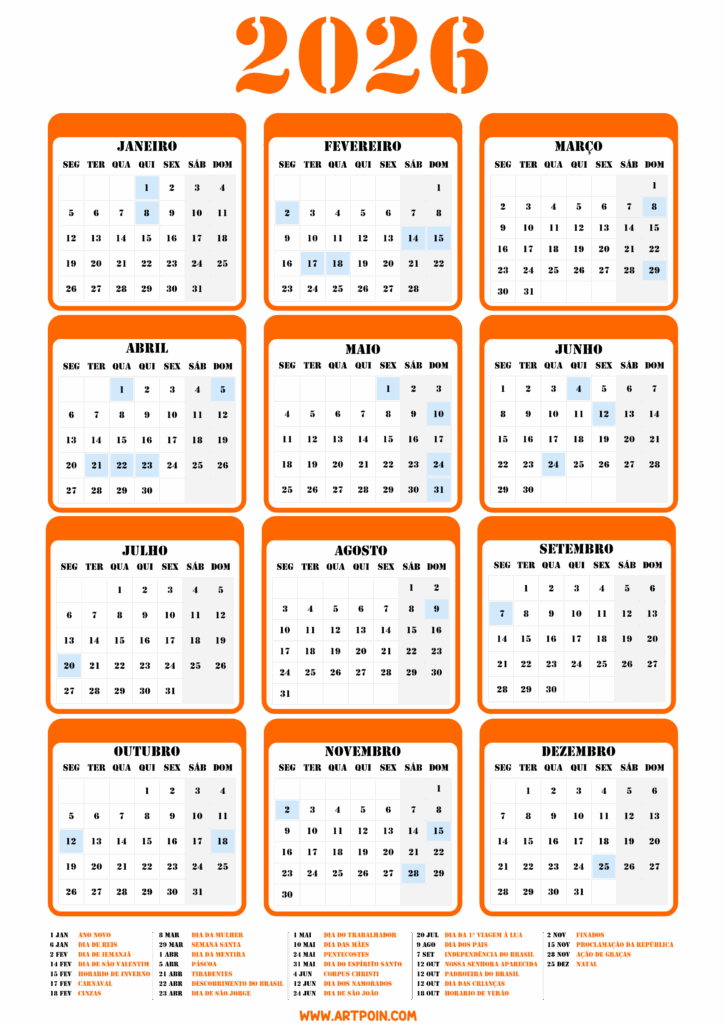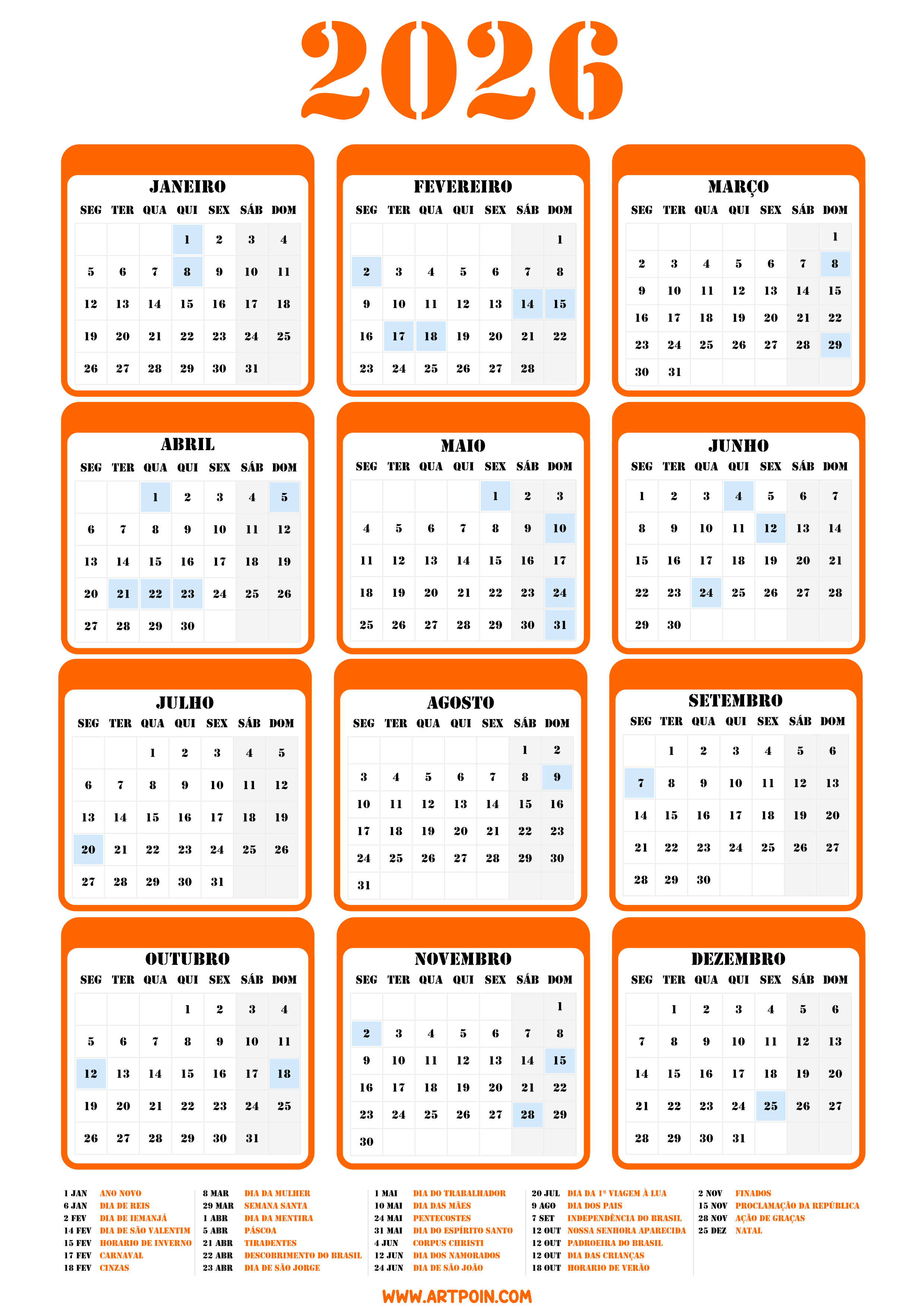 Calendário 2026 com todos os meses e datas comemorativas ideal para edição e impressão cor laranja gratuito para baixar png