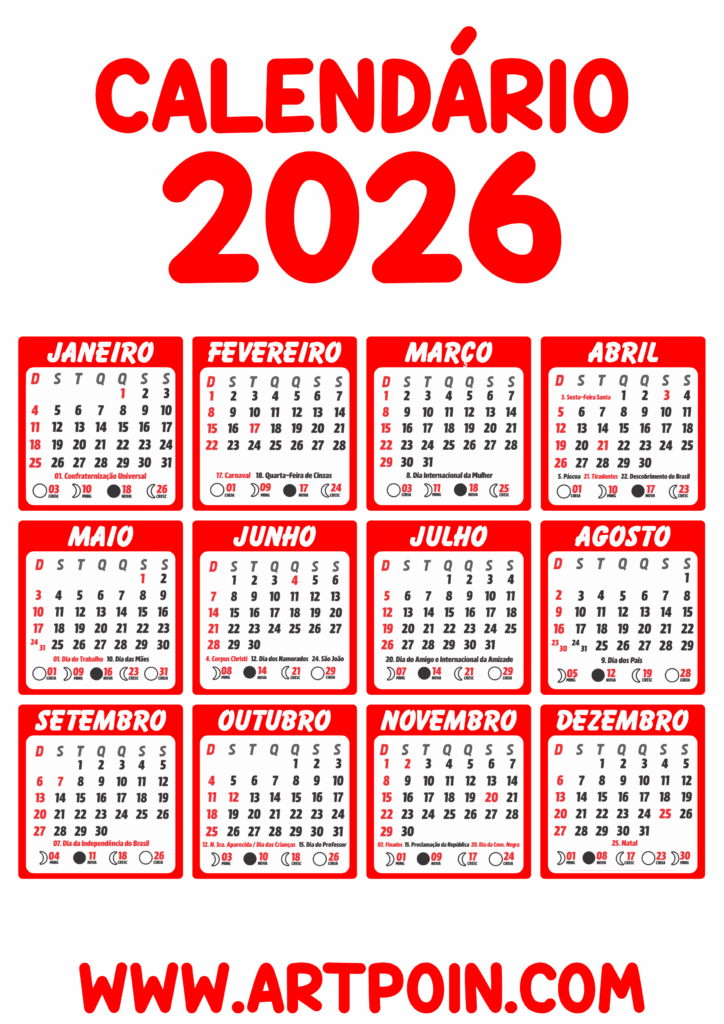 Calendário 2026 edições gráficas vermelho png
