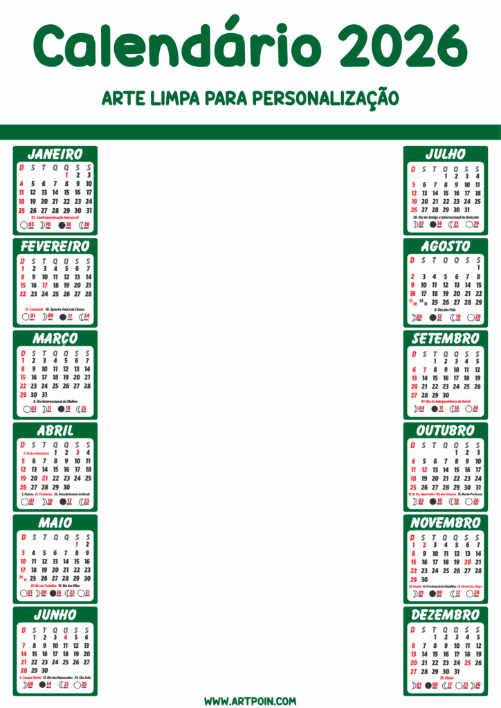 Calendário 2026 verde artes limpas para personalização com fundo transparente pronto para editar e imprimir png