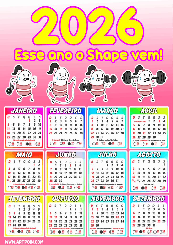 Calendário personalizado 2026 rosa pronto para imprimir esse ano o shape vem musculação flork of cows png