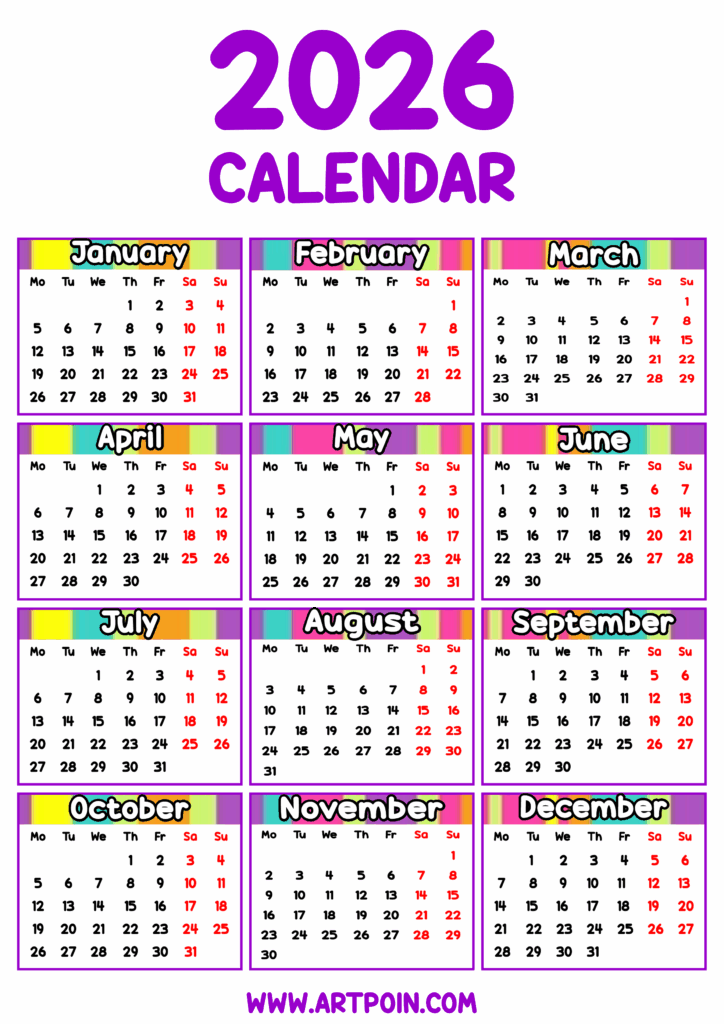 2026 calendar editable printable multi colors free arts and decorations png