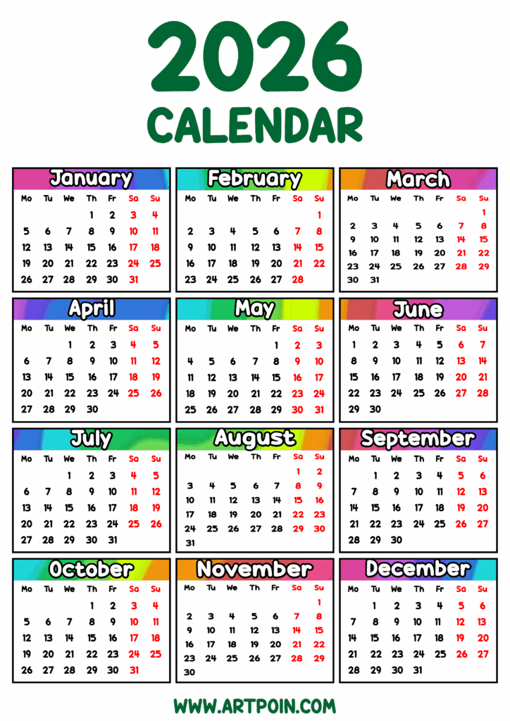 2026 calendar editable printable multi colors png