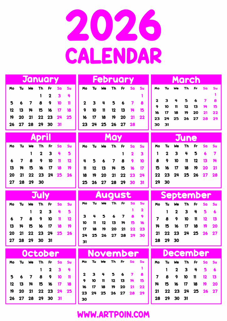 2026 calendar printable pink png