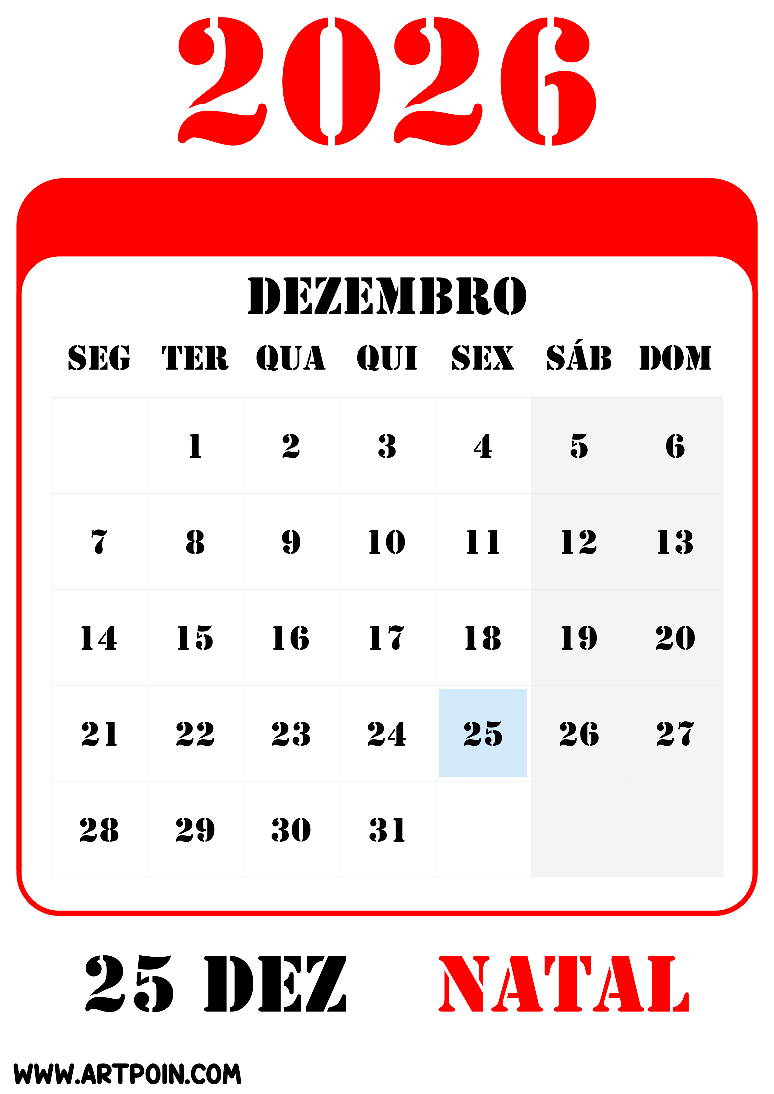 Feriados e datas comemorativas de dezembro calendário 2026 png